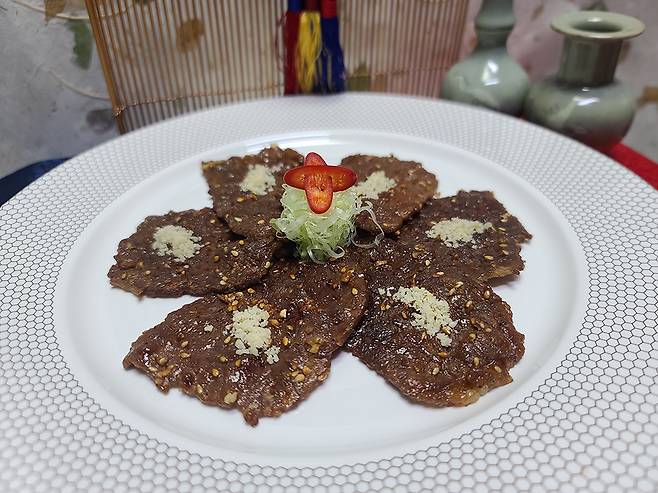 7. 접시에 ‘④’의 대파와 ‘⑥’의 너비아니를 예쁘게 담아 잣가루를 뿌려 완성한다.