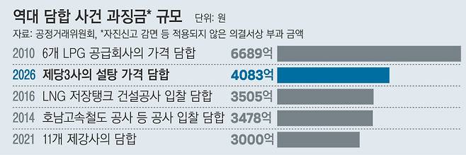 이번 사건의 과징금 부과 액수는 역대 담합 사건 중 두 번째로 많다. 특히 사업자당 평균 부과금액(1361억원)은 역대 최대다. 다만 향후 리니언시(자진감경 제도)가 적용되면 담합 업체들이 실제 부담하는 과징금 액수는 줄어들 수 있다. 공정위는 앞서 지난해 검찰의 고발 요청으로 담합을 주도한 3개사 및 주요 임직원 11명을 고발했다.