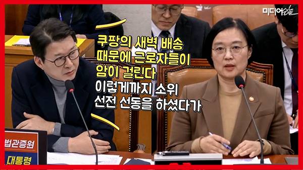 신 의원은 “쿠팡 문제에 대해선 새벽배송 때문에 이 기업을 굉장히 부도덕한 기업인 것처럼 매도해 왔다”며 “다른 데서 하는 건 아름다운 새벽배송이고, 쿠팡은 근로자 죽이는 새벽 배송이냐?”고 지적했다. 한 장관이 “그건 새벽배송 자체에 대한 이야기라기보다는 새벽배송을 하는 과정에서 많은 노동자가”라고 하자, 말을 끊은 신 의원은 “아니요. 그동안 논란이 됐던 것들을 많이 보셨을 것”이라며 “새벽배송 자체가 굉장히 근로자들의 건강권을 침해한다고 그래서 새벽 배송 자체를 굉장히 문제시해 왔다”고 반박했다.