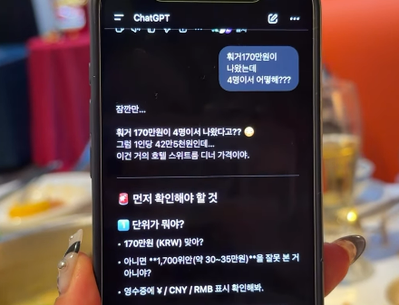 챗GPT는 "훠궈 170만원이 4명이서 나왔다고? 그럼 1인당 42만5000원인데. 이건 거의 호텔 스위트룸 디너 가격"이라며 당황한 반응을 보였다.