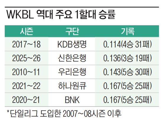 신한은행은 지난 11일 열린 2025~26 여자프로농구 아산 우리은행과의 홈 경기를 65-69로 패했다. 6연패 늪에 빠진 신한은행의 승률은 0.136(3승 19패)까지 떨어졌다. 여름·겨울리그가 통합돼 단일 시즌으로 치러진 2007~08시즌 이후 여자프로농구 역대 최저 승률은 2017~18시즌 KDB생명이 남긴 0.114(4승 31패)이다. 신한은행은 남은 정규시즌 8경기를 모두 패할 경우 이 기록을 밑돌게 된다. 산술적으로 가능성은 크지 않지만, 그만큼 팀 상황이 심각하다.