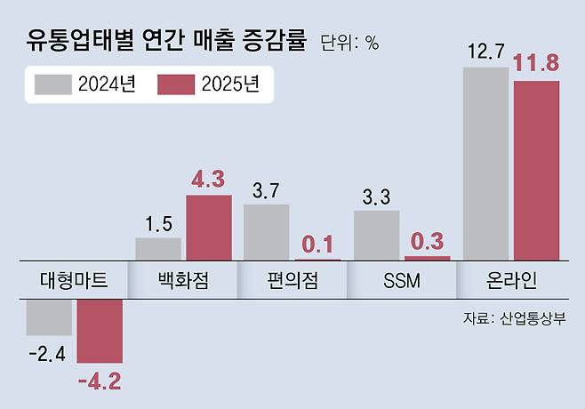 편의점은 외형은 유지했지만 성장 동력은 둔화됐다. 지난해 편의점 업계 전체 성장률은 0.1%로, 2023년(8.1%)과 2024년(3.7%)에 비해 둔화됐다. 편의점 4사 점포 수는 2024년 말 5만4800여 개에서 2025년 말 5만3200여 개로 줄었다. 출점 확대에 의존한 외형 성장 전략이 한계에 이르렀다는 분석이 나온다. 구매단가는 상승했지만 방문객 수가 줄어들면서 매출 증가 폭이 제한됐다. 대형마트의 부진은 더 뚜렷했다. 지난해 대형마트 매출은 4.2% 감소하며 2년 연속 역성장을 기록했다. 식품과 생활용품 소비가 온라인으로 이동하고 1∼2인 가구 증가로 대량 구매 수요가 줄어든 데다, 홈플러스 영업 부진 영향이 컸다.