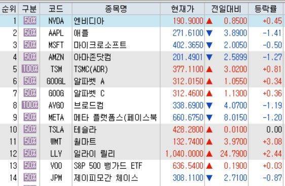시가총액 상위 종목을 보면 나스닥에 상장된 빅테크의 약세가 두드러졌다. 애플 -1.41%, 마이크로소프트 -0.50%, 아마존닷컴 -1.27%, 메타 -1.20% 등이 하락률 상위권에 이름을 올렸다. 반면 엔비디아 +0.45%, TSMC +0.81%, 알파벳 A +0.34% , 월마트 +3.08%, 일라이릴리 +2.44% 등의 상승률이 눈에 띈다.