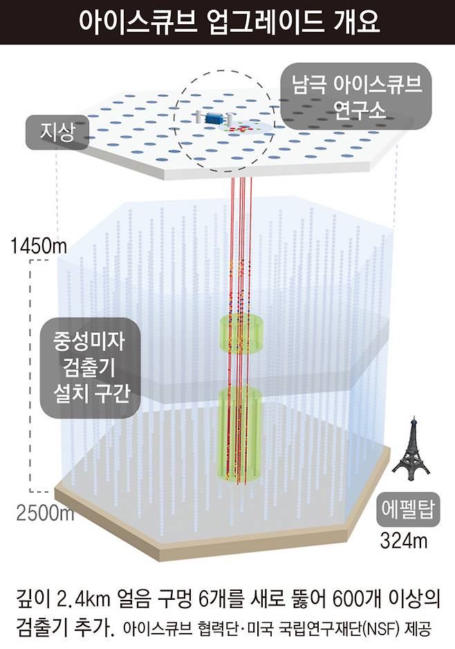 2km 두께의 남극 얼음 아래에서 우주의 기본입자인 ‘중성미자’의 비밀을 밝히는 거대 과학실험 장치 ‘아이스큐브(IceCube)’가 가동을 시작한 2011년 이후 약 15년 만에 업그레이드됐다. 중성미자의 흔적을 포착하는 초고감도 검출기가 기존 5160개에서 약 5800개까지 늘어났다.