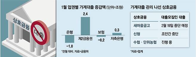 상호금융권은 지난해 가계대출 총량 목표치를 크게 초과한 데 이어 1월 가계대출 증가세 전환에도 ‘주범’으로 지목되고 있다.