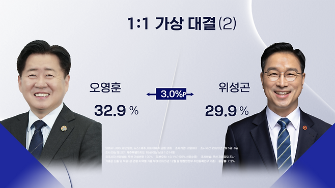오영훈 지사가 32.9%, 위성곤 국회의원이 29.9%로 3%p 차이가 났습니다.