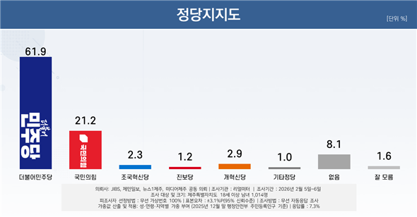 더불어민주당 지지율이 61.9%, 국민의힘 21.2%, 개혁신당 2.9%, 조국혁신당 2.3% 순이었습니다.