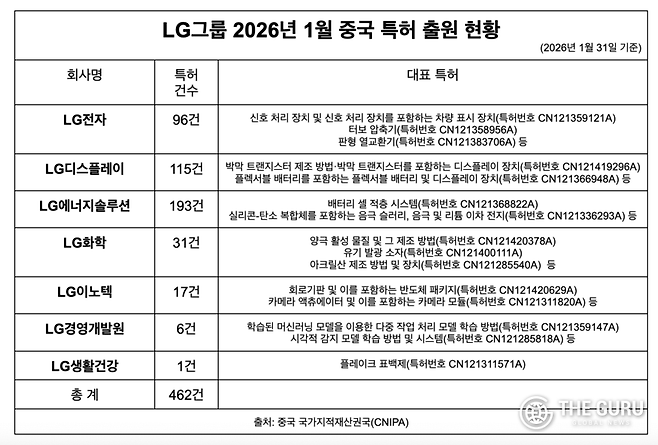 LG그룹이 지난달 중국에서 대규모 특허 승인을 확보하며 배터리·전장·디스플레이·인공지능(AI) 등 핵심 기술 영역에서 기반을 넓혔다.