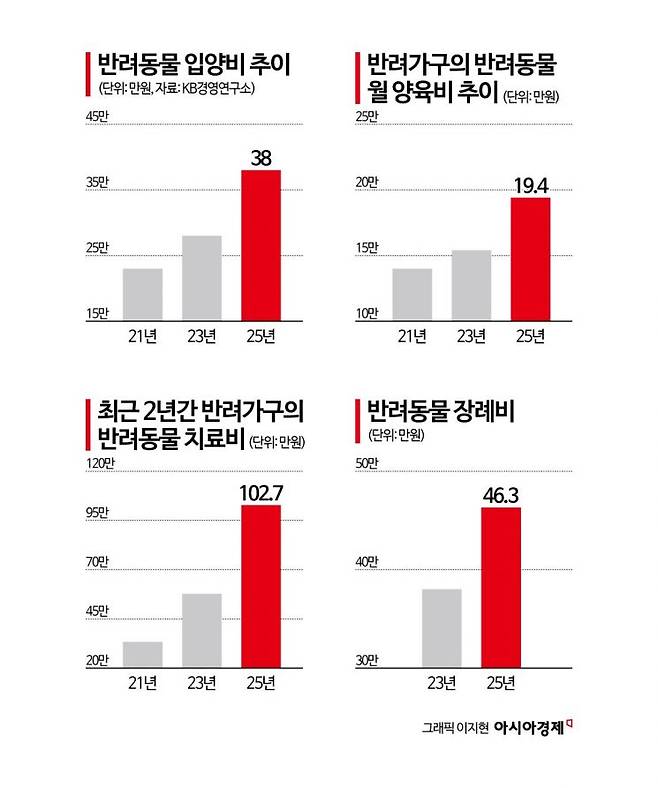 반려동물 생애 지출의 출발점은 입양비다. KB경영연구소에 따르면 지난해 반려가구가 입양비로 지출한 금액은 평균 38만원으로, 2023년(28만원)보다 10만원 늘었다. 입양비 분포 변화도 뚜렷하다. 2021년에는 '입양비 없음' 비중이 43%로 가장 컸지만, 지난해에는 39.9%로 낮아졌다. 반면 100만원 이상을 지출한 비중은 같은 기간 3.1%에서 13.5%로 4배 이상 확대됐다. 50만~99만원 구간도 7.5%에서 16.3%로 증가했다. 저비용 입양 중심 구조에서 중·고비용 입양으로 이동하고 있다는 분석이다.