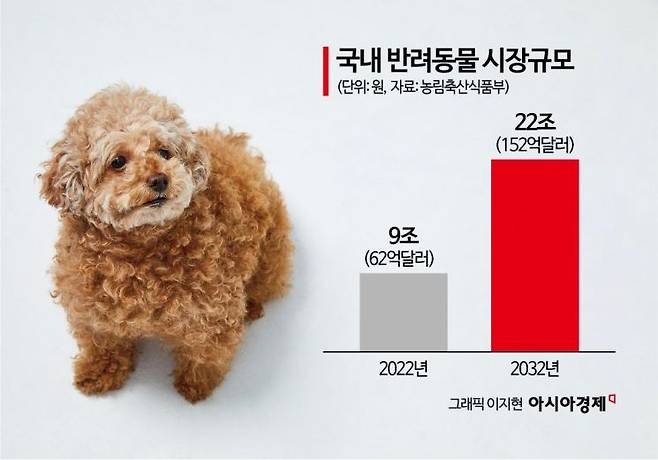 13일 농림축산식품부에 따르면 국내 반려동물 시장 규모는 2022년 9조원(약 62억 달러)에서 2032년 22조원(약 152억 달러)으로 두 배 이상 커질 것으로 예상된다. 사료와 간식 중심이던 시장은 의료·보험·교육·여행·장례로 영역을 넓히며 이른바 '펫코노미(Pet Economy)'로 진화하고 있다.