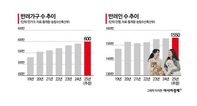 반려동물을 키우는 가구 수 역시 증가세다. 2019년 531만 가구였던 반려가구는 2024년 591만 가구, 지난해에는 600만 가구 수준으로 늘어났다. 반려인구도 같은 흐름을 보인다. 2019년 1477만명이던 반려인 수는 2023년 1541만명, 2024년 1546만명으로 늘었고, 지난해에는 1550만명 수준에 이를 것으로 추산된다. 단순 계산하면 국민 10명 중 3명이 반려동물과 함께 사는 셈이다.