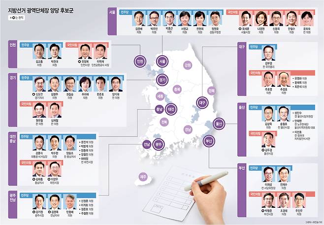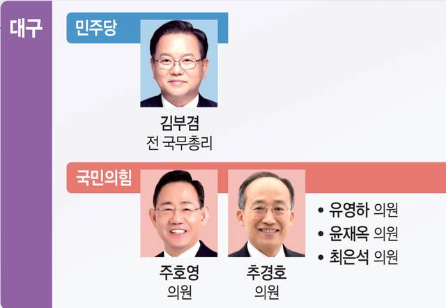 ‘보수 텃밭’인 대구·경북(TK)에서는 국민의힘 출마자들이 줄을 잇고 있다. 비어 있는 대구시장 자리에 주호영(6선) 국회 부의장, 윤재옥(4선)·추경호(3선)·유영하(초선)·최은석(초선) 의원 등이 출사표를 던졌다. 지역의 한 의원은 “다음 국회의원 총선거에서 물갈이 대상이 될 수 있어 중진 의원끼리의 경쟁이 치열하다”고 전했다. 경북은 3선 의지를 불태우고 있는 이철우 지사에 대해 김재원 최고위원, 이강덕 포항시장, 최경환 전 경제부총리 등이 도전장을 냈다. 3선 김정재·임이자 등 현역 의원이 나설 수도 있다.