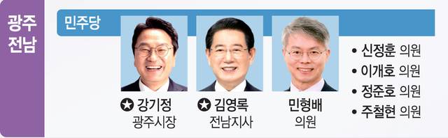 민주당의 텃밭인 광주·전남은 다른 지역에 비해 통합 가능성이 크다는 관측이 나오는 가운데 ‘초대 특별시장’ 자리를 놓고 김영록 전남지사, 강기정 광주시장 등 민주당 현역 단체장이 맞붙게 된다. 여기다 이개호(4선)·신정훈(3선)·민형배(재선)·주철현(재선)·정준호(초선) 의원 등 현역 민주당 의원들도 경쟁자로 나선다. 전북은 민주당 소속 김관영 지사를 상대로 안호영(3선)·이원택(재선) 민주당 의원, 정헌율 익산시장 등이 몸을 풀고 있다.