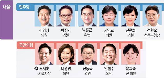 서울은 국민의힘 소속 오세훈 시장에 맞서 7명 이상의 여당 후보가 도전장을 내민 모양새다. 본선만큼이나 치열한 내부 경선이 예상되는 배경이다. 이재명 대통령의 ‘SNS 공개 칭찬’을 기점으로 유력 후보로 급상승한 정원오 성동구청장과 4선 박홍근·서영교 의원, 3선 전현희·박주민 의원, 재선 김영배 의원 등 현역 의원 5명이 본선 티켓을 놓고 경쟁할 것으로 보인다. 박용진 전 의원 등도 출마를 고심 중이다. 야권에서는 오 시장의 5선 도전 속에서 4선 안철수 의원 등의 등판을 요구하는 목소리도 나온다. 나경원(5선)·신동욱(초선) 의원 등도 언급된다. 윤희숙 전 의원도 출마 의사를 밝혔다.
