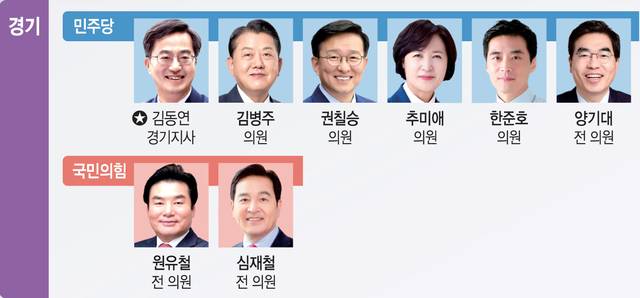 경기는 민주당 소속 김동연 지사가 재선에 도전한다. 민주당에서는 권칠승(3선)·김병주(재선) 의원이 출마 선언한 상황이다. 추미애(6선)·한준호(재선) 의원도 준비하고 있고 양기대 전 의원도 뛰어들었다. 반면 야권은 경기지사 선거를 ‘사실상 포기했다’는 평가가 나올 정도로 조용한 분위기다. 유승민 전 의원이 거명되고 있지만 뚜렷한 동향은 없고, 심재철·원유철 전 의원 등이 준비 중인 것으로 알려졌다.