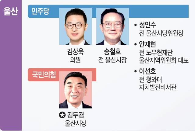 국민의힘 소속 김두겸 울산시장에 대한 당내 경쟁 후보는 뚜렷하지 않은 기류다. 김기현(5선)·서범수(재선) 등 현직 의원이 거명됐다가 수면 아래로 내려간 분위기다. 민주당에서는 송철호 전 울산시장, 이선호 전 청와대 자치발전비서관, 안재현 전 노무현재단 울산지역위원회 대표, 성인수 전 울산시당위원장 등이 나섰다. 박완수 지사가 재선에 도전하는 경남에서는 조해진 전 국민의힘 의원이 출마 선언을 했다. 민주당에서는 대통령 직속 지방시대위원회 김경수 위원장이 경남지사 후보로 유력하게 거론된다.