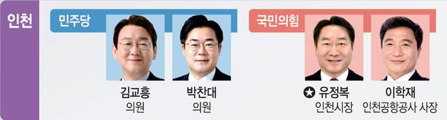 인천은 이 대통령이 민주당 대표 시절 원내대표를 지냈던 박찬대(3선) 의원이 출마를 확정한 상태다. 김교흥(3선) 의원이 경선에서 박 의원과 맞붙을 것으로 보인다. 국민의힘 소속 유정복 인천시장이 3선 도전에 나서고, 같은 당 이학재 인천국제공항공사 사장의 출마 가능성도 있다. 공직선거법에 따라 이 사장이 출마하려면 오는 3월 5일 이전 퇴직해야 한다.