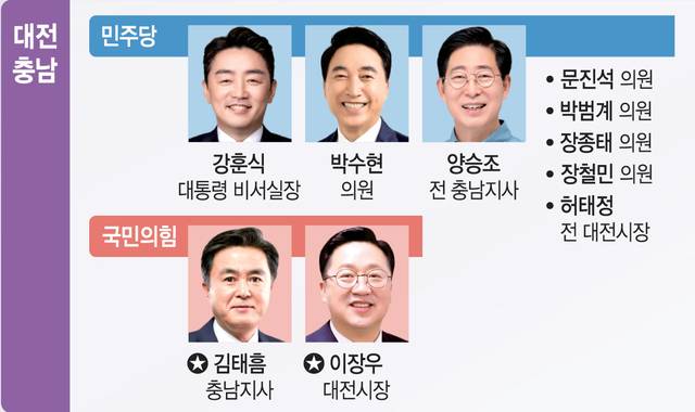‘중원’ 선거에도 관심이 모인다. 여권에서 드라이브를 건 충남·대전 통합 선거의 성사 여부에 관심이 쏠리는 가운데 대전에 지역구를 둔 박범계(4선)·장철민(재선)·장종태(초선) 등 현역 의원이 출마 선언을 했다. 재선 박수현·문진석 의원 등 충남 일부 의원도 검토 중이다. 양승조 전 충남지사, 허태정 전 대전시장 등 원외에서도 가세하며 수도권만큼이나 치열한 민주당 내 경선을 예고했다. 특히 강훈식 대통령 비서실장의 ‘차출론’이 계속되면서 강 실장의 출마에 따라 판세가 요동칠 수 있다는 전망이 나온다. 국민의힘은 김태흠 충남지사, 이장우 대전시장 등 현직 단체장 외 후보는 드러나지 않은 상황이다.