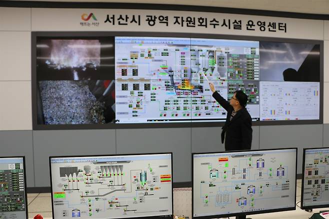 | ▲ 서산시자원회수시설 운영센터. 대형 모니터월을 통해 쓰레기 반입부터 소각, 배출까지 전 과정을 실시간으로 관리하고 있다. |