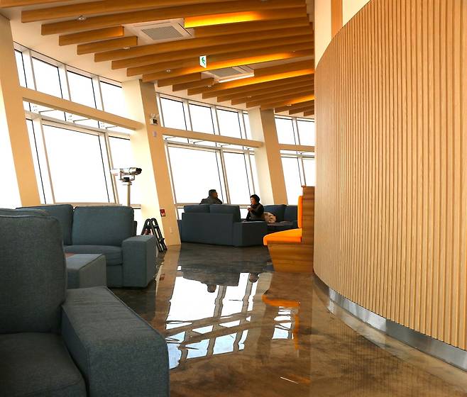엘리베이터 문이 열리면 원통형으로 설계된 스카이라운지가 펼쳐진다. 통유리창 너머로 양대동 들판이 시야 가득 들어오고, 바닥 일부에는 유리판이 깔려 있다. 그 위에 서면 발아래 구불구불 이어진 하천이 보인다. 갈대가 둘러싼 물길은 마치 바다로 흘러가는 갯골처럼 굽이치며 펼쳐진다.
