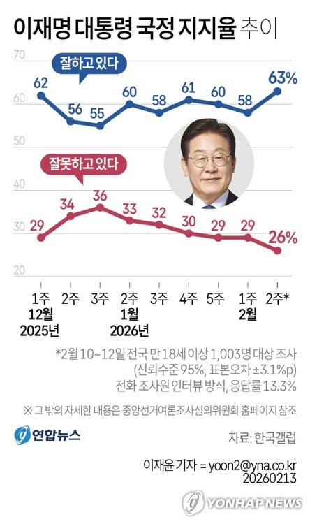 (서울=연합뉴스) 원형민 기자 = 한국갤럽이 지난 10∼12일 전국 만 18세 이상 1천3명을 대상으로 이재명 대통령의 직무수행에 관한 지지도를 조사한 결과 응답자의 63%가 '잘하고 있다'고 답했다.