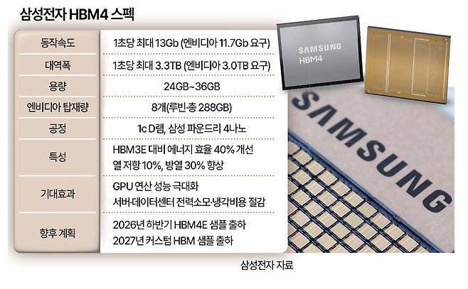 ▶최고성능으로 SK하이닉스 기선제압=HBM4로 가는 길목에서 그동안 제기된 기술 결함 논란을 털어낸 삼성전자는 이날 SK하이닉스보다 먼저 HBM4 12단 제품 출하 사실을 발표하며 기선제압에 나섰다. HBM4 성능에 대한 자신감을 엿볼 수 있는 대목이다.