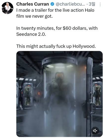 미국 다큐멘터리 영화 감독인 찰스 커런은 소셜미디어를 통해 드라마 '헤일로'의 1분 24초짜리 예고편을 만들었다면서 "시댄스2.0을 이용해 20분 만에 60달러(약 8만6천원)로 했다. 할리우드가 진짜 망할 수도 있다"고 말했습니다.