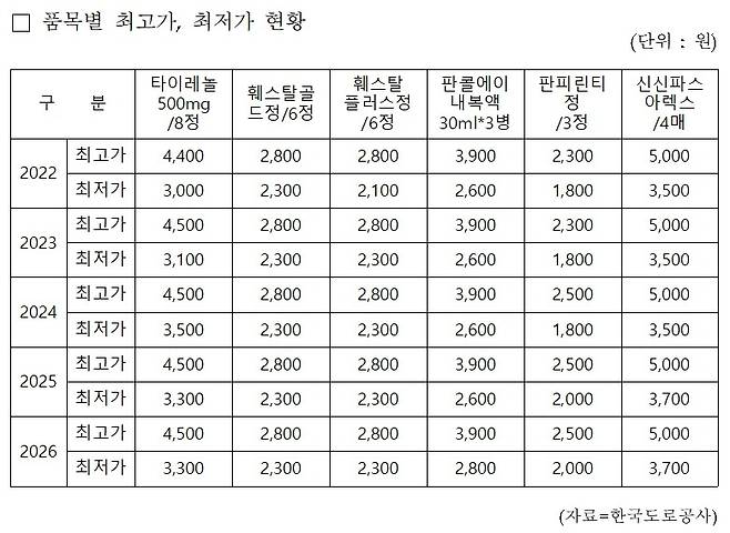 황 의원이 한국도로공사로부터 제출받은 '전국 고속도로 휴게소 판매 의약품 가격 현황' 자료를 분석한 결과 보건복지부 안전상비의약품 약국 외 판매제도 대상 품목 중 휴게소에서 주로 판매되는 6개 품목의 최근 5년간(2022~2026년) 최고가와 최저가 간 격차가 지속적으로 발생한 것으로 나타났다.