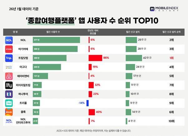 아이지에이웍스의 ‘모바일인덱스’(Android OS+iOS 기준 월간 사용자 수, MAU)에 따르면, 트립닷컴은 2026년 1월 기준 월간 사용자 수 269만 명을 기록하며 한국 시장에서 글로벌 OTA(Online Travel Agency) 가운데 사용자 수 1위를 차지했다.