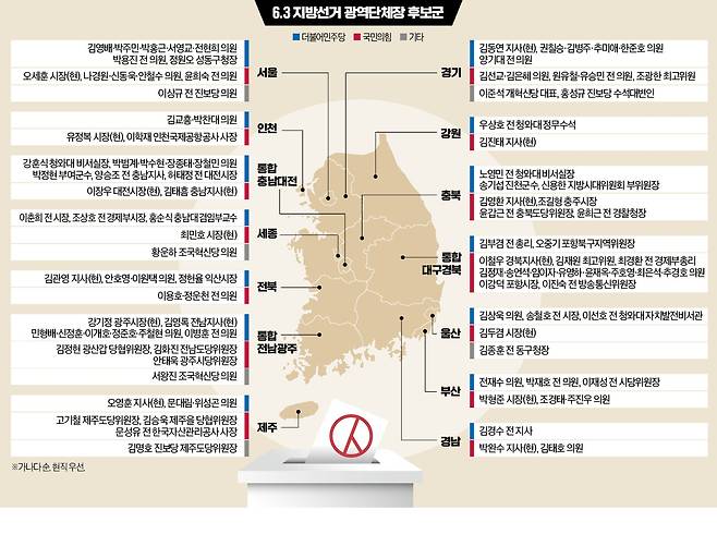 6·3 지방선거를 110일 앞둔 13일 여야 광역단체장 대진표의 윤곽이 서서히 드러나고 있다. 더불어민주당은 이재명 대통령의 높은 지지율에 힘입어 수도권과 호남, 충청을 중심으로 출마 선언이 잇따르며 치열한 경선을 예고했다. 국민의힘은 2022년 지방선거에서 석권한 서울과 부산 등 12곳을 사수하기 위해 총력전 태세에 들어갔다. 다만 현역 단체장에 맞설 중진들이 막판까지 출마를 고심하고 있어 이들의 결심이 경선 판도의 변수가 될 것으로 전망된다.
