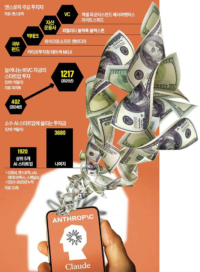 앤스로픽 사례는 글로벌 자본시장의 무게중심이 상장사 중심인 주식시장에서 비상장 AI시장으로 옮겨가고 있음을 상징한다는 분석이 나온다. 자금 이동은 통계로도 확인된다. 시장조사업체 피치북에 따르면 지난해 말 기준 AI 투자로 유입된 비(非)VC 자금은 1217억달러로 전년(402억달러) 대비 세 배 이상 증가했다. 지난해 오픈AI, 앤스로픽, xAI, 데이터브릭스, 스케일AI 등 5개 기업이 전체 스타트업 펀딩의 46%를 차지하는 이른바 ‘메가 라운드’ 현상이 나타났는데, 이들이 글로벌 자본시장 유동성을 블랙홀처럼 빨아들이고 있다.