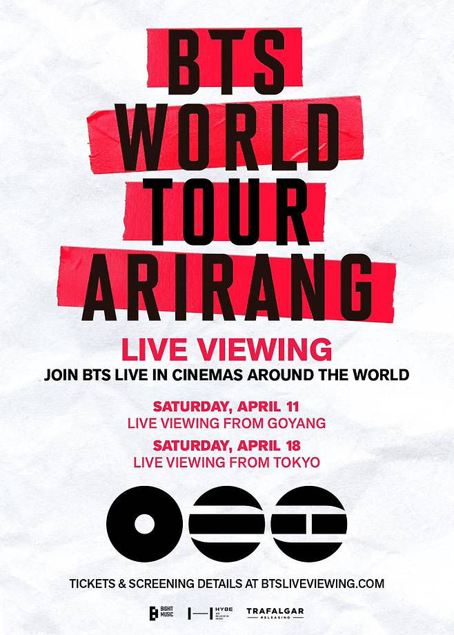 하이브(HYBE)는 오는 4월 11일 고양종합운동장에서 열리는 한국 공연과 4월 18일 일본 도쿄 공연을 ‘라이브 뷰잉(Live Viewing)’으로 전 세계에 동시 송출한다고 밝혔다. 이번 라이브 뷰잉은 전 세계 75개 국가 및 지역, 3,500개 이상의 상영관에서 대규모로 진행된다. 국내에서는 CGV, 롯데시네마, 메가박스 등 주요 멀티플렉스 3사에서 관람할 수 있으며, 예매는 오는 2월 25일 오전 10시부터 시작되어 또 한 번의 ‘피켓팅(피 튀기는 티켓팅)’을 예고했다.