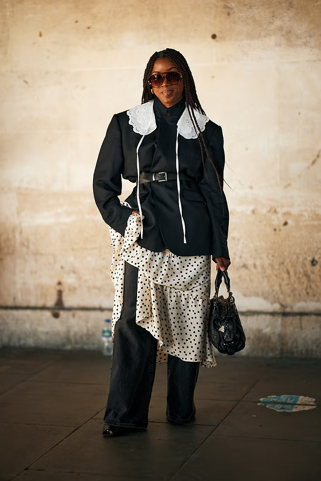 런던 패션위크에서는 폴카 도트 드레스와 배기 진이라는 새로운 레이어링 이 포착됐습니다. 벨트 재킷으로 허리를 정리해 실루엣을 다듬는 일도 잊지 않았죠. 드레스와 데님의 조합은 더 이상 낯설지 않습니다. 오히려 가장 동시대적인 선택에 가깝죠.