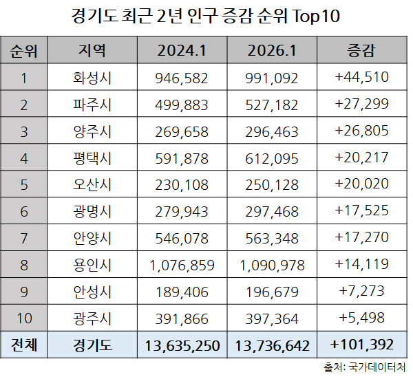 경기도 인구 10만 명 증가… 화성·파주·양주 늘고 수원·고양 감소