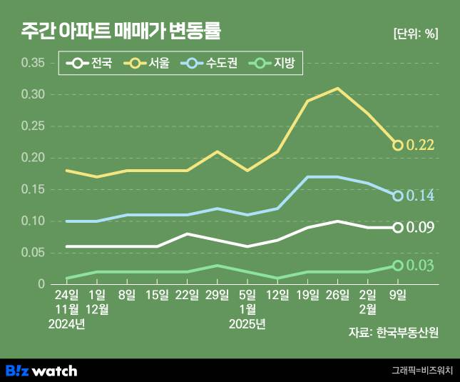 한국부동산원은 2월 둘째 주(9일 기준) 서울 아파트 평균 매매가격이 전주 대비 0.22% 올랐다고 발표했어요. 53주 연속 상승이지만 지난주 상승률과 비교하면 0.05%포인트 낮아졌어요.