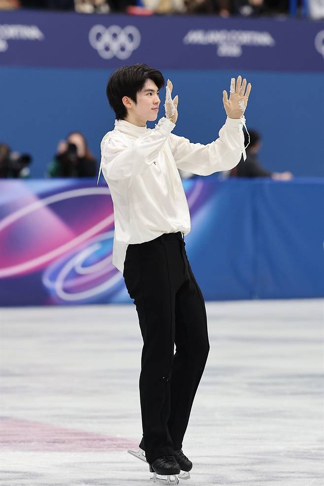 | ▲ 13일(현지시간) 이탈리아 밀라노 아이스스케이팅 아레나에서 열린 2026 밀라노ㆍ코르티나담페초 동계올림픽 남자 싱글 프리 스케이팅에 출전한 차준환이 연기를 마친 뒤 관중에 인사하고 있다. 차준환은 이날기술점수(TES) 95.16점, 예술점수(PCS) 87.04점, 감점 1점, 총점 181.20점을 받아 4위를 기록했다. |