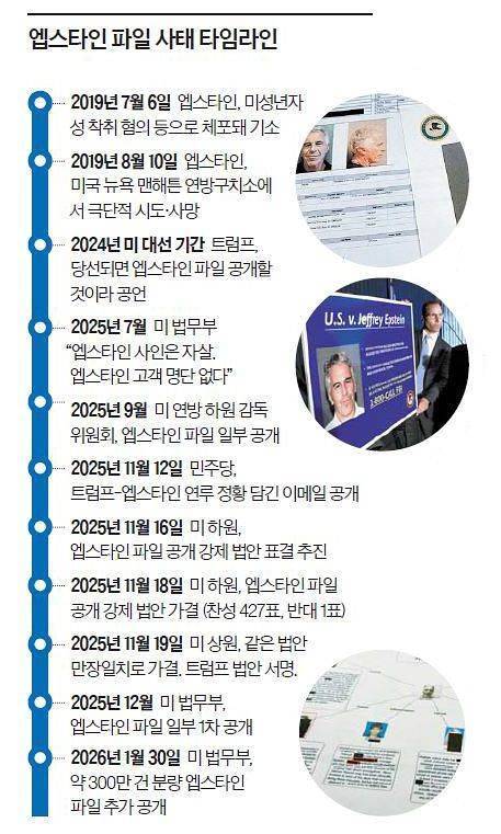 사실 엡스타인의 석연치 않은 죽음을 활용한 이는 트럼프 대통령이었다. 트럼프는 2024년 대선 당시 관련 음모론을 활용해 지지층을 결집했다. 그의 죽음 배후에 민주당 내 비밀 권부인 ‘딥 스테이트’가 있고, 조 바이든 당시 행정부가 이를 들추기 꺼린다고 주장했다. 트럼프는 대통령에 당선되면 엡스타인과 교류한 인사 명단 등을 공개하겠다는 약속했다. 그러나 트럼프 대통령 당선 이후인 지난해 7월 미 법무부는 엡스타인의 사인은 자살이고 명단은 없다고 발표했다. 그러자 진영을 불문하고 비판이 쏟아졌다. 결국 트럼프 행정부는 지난해 11월 의회에서 통과한 ‘엡스타인 파일 투명성 법’에 따라 관련 파일을 공개하고 있다. 파일에는 트럼프 대통령과 엡스타인의 친분을 유추할 수 있는 사진과 이메일 기록 등도 담겼다.