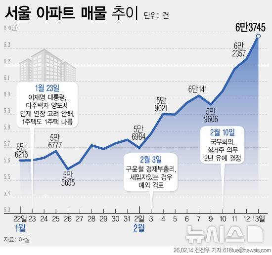 [서울=뉴시스] 14일 부동산 플랫폼 아실에 따르면 서울 아파트 매물은 지난 13일 기준 6만3745건으로 집계됐다. 이는 이재명 대통령이 양도세 중과 유예 종료 방침을 밝혔던 지난 1월 23일(5만6219건) 대비 11.8% 증가한 수치다. 한 달도 채 되지 않아 7500건 이상 매물이 늘어난 셈이다. 정부가 세입자 보호를 전제로 다주택자의 '전세 낀 매물' 처분을 허용하면서 서울 아파트 매물이 빠르게 증가하고 있는 것이다. (그래픽=전진우 기자)