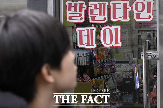 [더팩트 | 송호영 기자] 밸런타인데이이자 설 연휴의 첫날인 14일 오후 서울 중구 명동의 한 상점에 기념일을 홍보하는 문구가 붙어 있다.