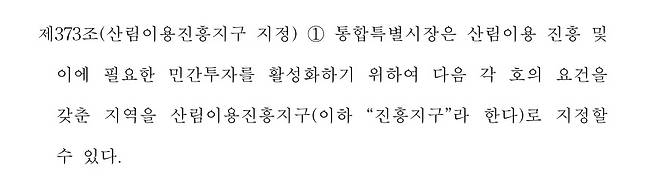 | ▲ 국회행안위가 대안으로 만든 특별법안 제373조는 '산림이용진흥지구의 지정'에 관한 조항으로, 통합특별시장이 산림 자원을 활용해 민간투자를 활성화하고 지역 경제를 살리기 위해 직접 특정 구역을 지정할 수 있는 권한과 그 요건을 규정하고 있다. |