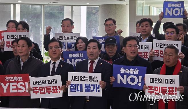 | ▲ 민주당 주도로 충남·대전통합특별법안이 국회 행정안전위원회 전체회의를 통과한 것과 관련, '대전충남 졸속통합 반대 범대전시민들'은 13일 오후 대전시의회 1층 로비에서 기자회견을 열고 "지방분권을 파괴한 민주당은 가짜 통합 졸속 법안을 즉각 폐기하라"고 촉구했다. |