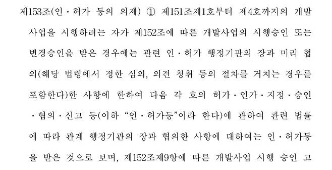 | ▲ 국회 행안위가 대안으로 만든 특별법안 제153조는 '인·허가 등의 의제'에 관한 조항으로, 통합특별시장이 개발사업의 시행을 승인하면 관련된 다른 법령에 따른 인허가를 한꺼번에 받은 것으로 간주하여 행정 절차를 파격적으로 단축해주는 내용을 담고 있다. |