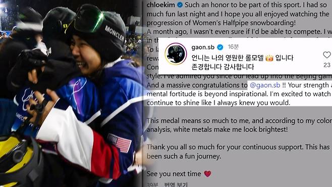 최가온은 이 글에 "언니는 나의 영원한 롤모델"이라며 "존경한다"는 댓글을 달았습니다.