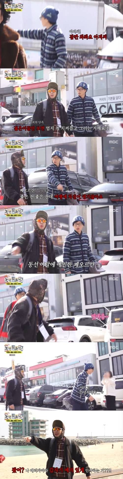 일행에서 뒤처진 하하를 본 유재석은 "저기 아저씨 아저씨! 잠깐만요. 왜 자꾸 젊은이들 보면 엄지손을 치켜 들고 그러냐. 좋은 건 좋은 건데 여행에 차질이 생긴다"며 발로 엉덩이를 걷어찼다. 그때 유재석을 발견한 어머님 팬은 "멋져요"라고 외쳤고, 분노하던 유재석은 "아이고 안녕하세요"라며 시민의 인사에 태세를 전환했다.