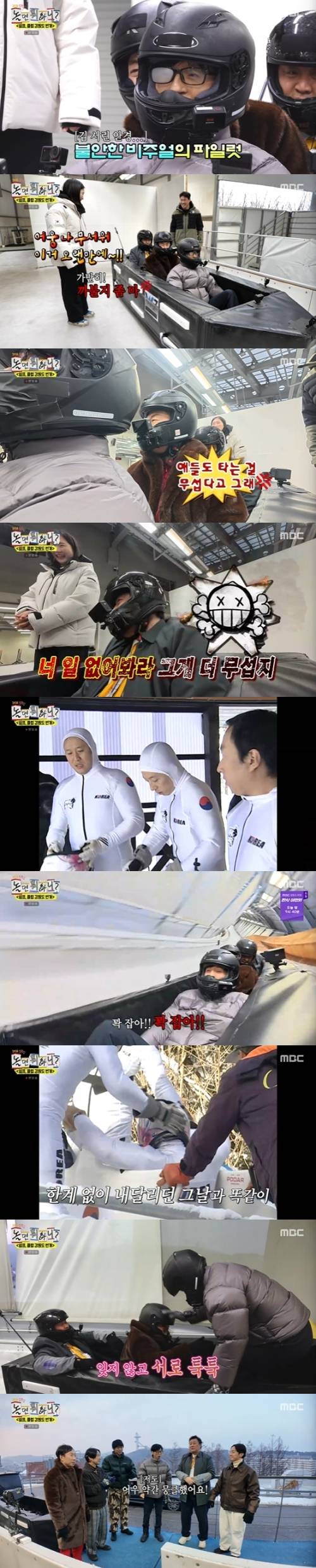 박명수는 "봅슬레이 탑승한 게 얼마만이냐?"고 했고, 정준하는 "어우 나 무서워"라며 긴장했다. 이에 박명수는 "예나 지금이나 너는 참...너 일 없어봐라. 그게 더 무섭지"라고 팩폭을 날려 웃음을 자아냈다. 유재석은 "나도 이거 앞자리는 안 타봤다"고 걱정했다.