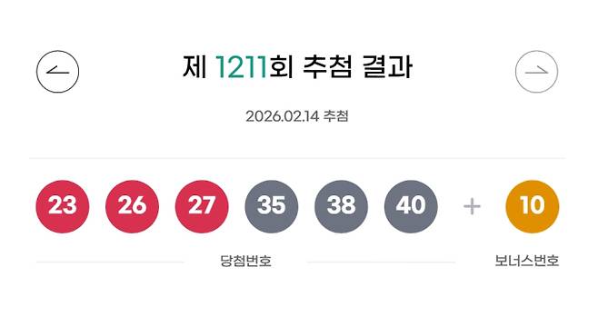 1211회 로또 당첨번호 조회 결과, 로또 복권 운영사 동행복권은 로또 복권 추첨에서 '23, 26, 27, 35, 38, 40' 번이 로또 1등 당첨번호로 뽑혔다고 밝혔다.