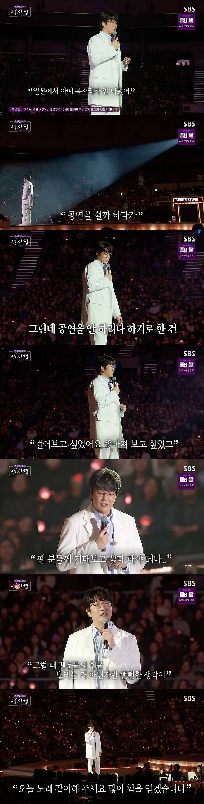 성시경은 "그래서 공연을 쉴까 생각하기도 했다. 그런데 왜 하기로 했냐면 걸어보고 싶었다. 좋아져보고 싶었다. 조금 염치가 없기도 하다 싶다"라며 말을 이어갔다. 그리고 심호흡을 하며 마음을 가다듬었다.