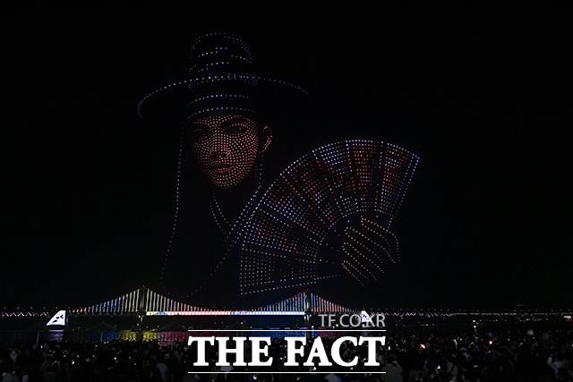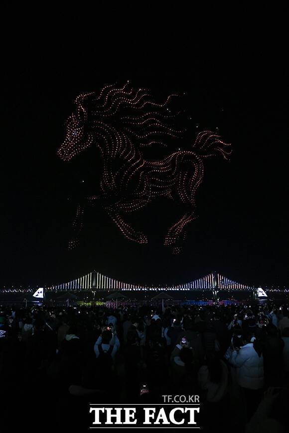 이날 공연은 '복이 깃드는 설날'을 주제로 2,500여 대의 드론이 동원됐다. 설날을 대표하는 복주머니와 붉은 말의 형상이 나오자 관람객들은 탄성을 내뱉었다.