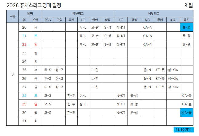 이번 시즌부터는 월요일에 경기가 편성된다. 월요일에 전 경기를 편성하고 화요일을 고정 휴식일로 운영한다.