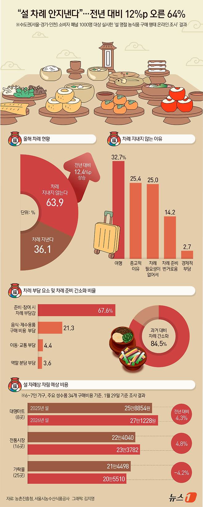 (서울=뉴스1) 김지영 디자이너 = 올해 설 명절에 차례를 지내지 않겠다는 가구가 10곳 중 6곳에 달했다. 농촌진흥청이 수도권 소비자 패널 1000명을 대상으로 '설 명절 농식품 구매 온라인 조사'를 벌인 결과 올해 설에 차례를 지내지 않겠다는 응답은 63.9%로 1년 전보다 12.4%포인트(p) 증가했다.